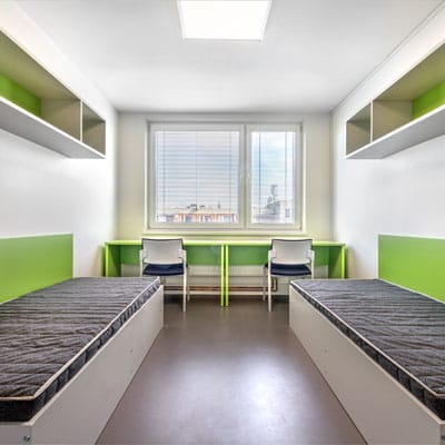 Кампус расположен в тихом районе на Праге 5, всего в 25 минутах от центра города. Станция метро Hůrka находится в 5 минутах ходьбы. В шаговой доступности — кафе, рестораны, аптеки и супермаркеты. Общежитие находится в зелёной части Праги, рядом с парками Přírodní park Košíře–Motol и лесопарком Cibulka.